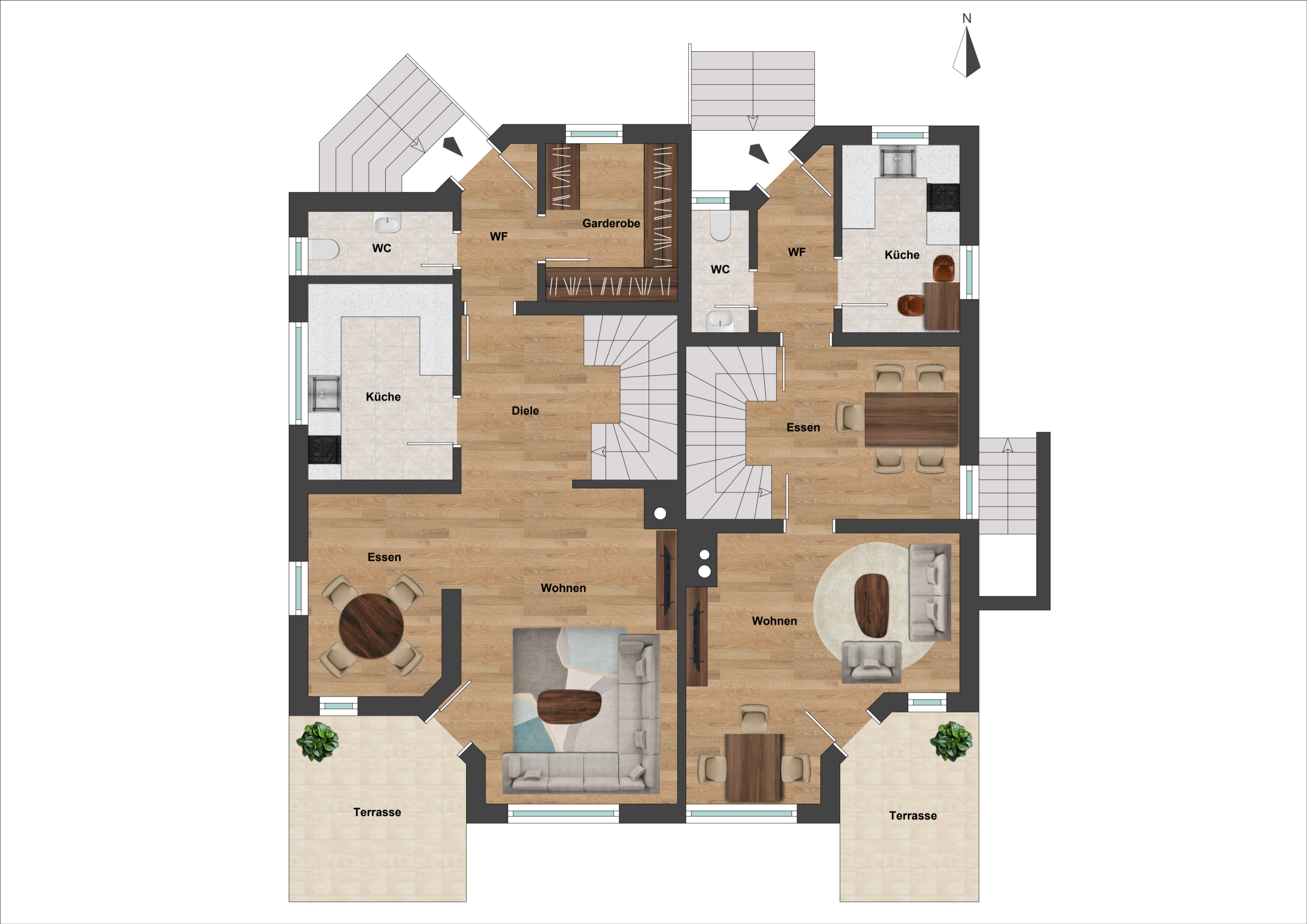 Beim Betreten des Hauses werden Sie von einem einladenden Eingangsbereich empfangen, beide Doppelhaushälften beherbergen ihren eigenen Hauseingang. Ein großer separater Garderobenraum findet sich im Eingangsbereich der rechten Haushälfte. Jede Haushälfte verfügt über eine sonnige und hübsche Küche, die mit einer modernen Einbauküche ausgestattet ist. Die Wohnzimmer sind sehr gemütlich gestaltet und bieten genügend Platz für entspannte Stunden mit der Familie samt separatem Esszimmer. Die großen Fenster lassen viel Tageslicht herein und bieten einen herrlichen Blick in den weitläufigen Garten.
